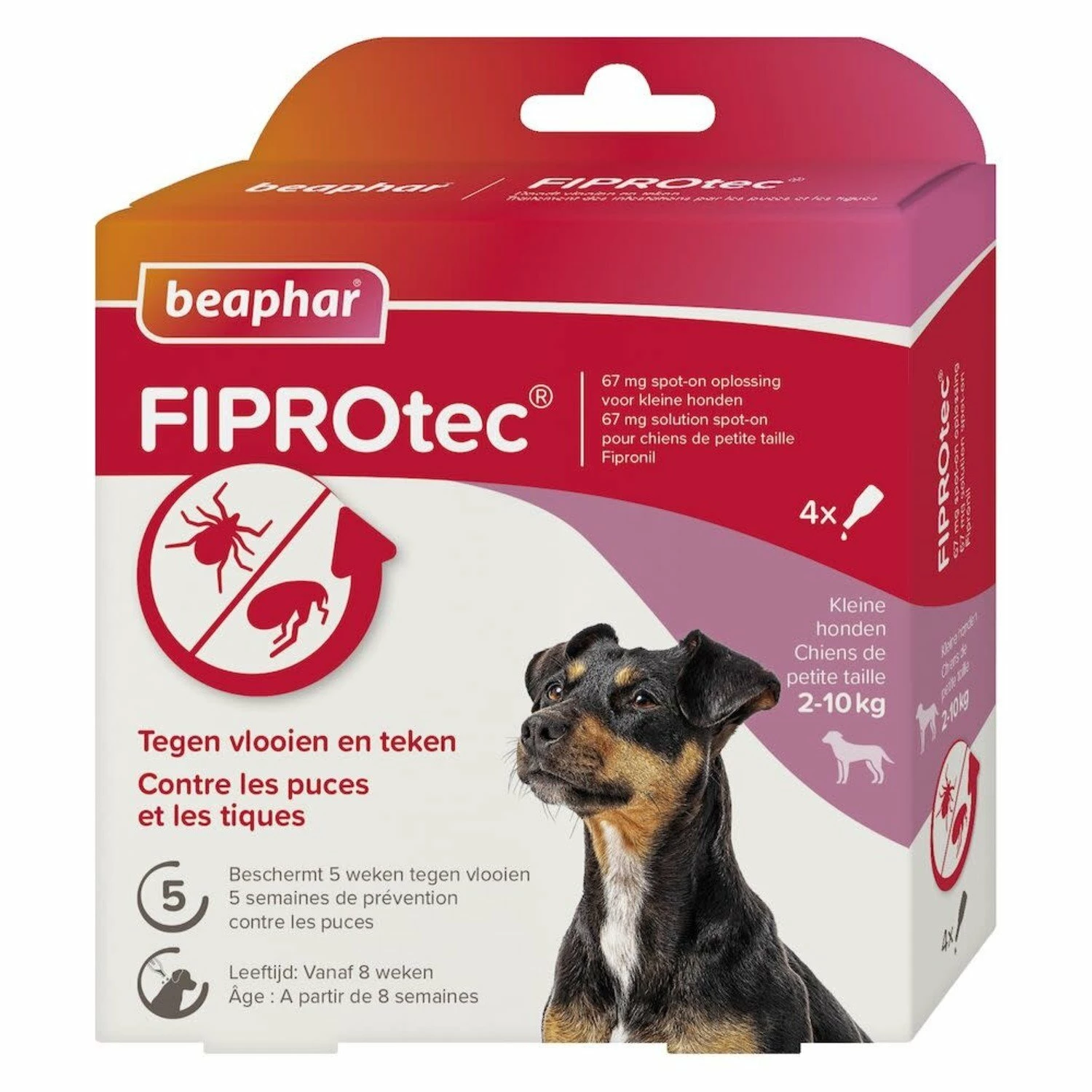 FIPROtec® is een effectief middel ter bestrijding van vlooien en teken. 1 pipet beschermt uw hond tot 5 weken tegen vlooien en tot 4 weken tegen teken. Geschikt voor honden vanaf 8 weken.