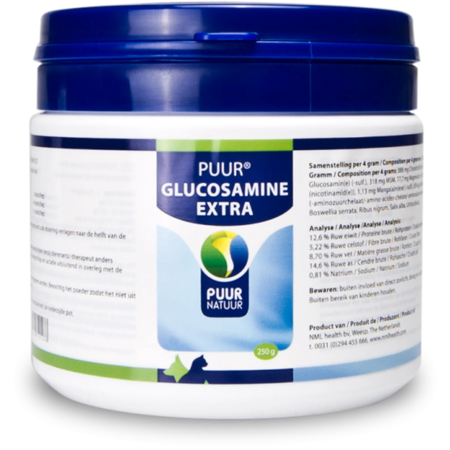 – Glucosamine sulfaat: goed voor de opbouw van kraakbeen in de gewrichten. Voor een soepele beweging, geeft verlichting en is goed voor de banden, spieren en kapsels.